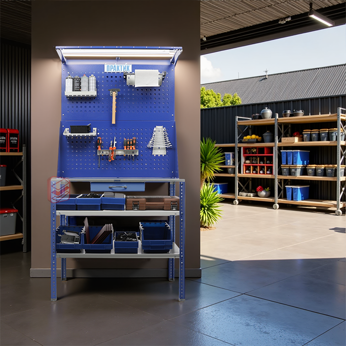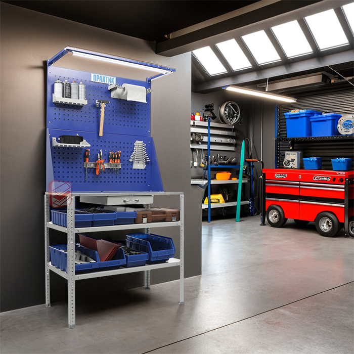 Верстак поставляется в одной коробке (размер упаковки: 1140x560x140 мм, вес 31 кг), что упрощает транспортировку и сборку. Благодаря возможности установки дополнительных элементов его можно адаптировать под любые задачи.